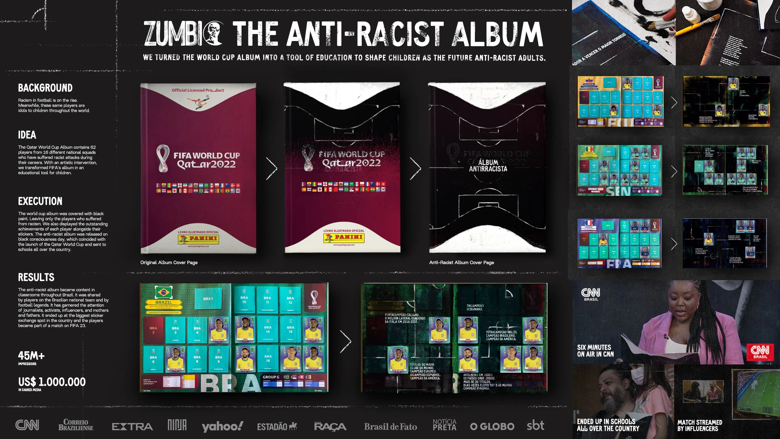 The World Cup Sticker Album is a big national passion for kids in Brazil. University Zumbi dos Palmares took that passion and turned into an educational tool to shape the anti-racist adults of the future. The project highlighted the achievements of 62 players that were in the World Cup and got media coverage all over the country.